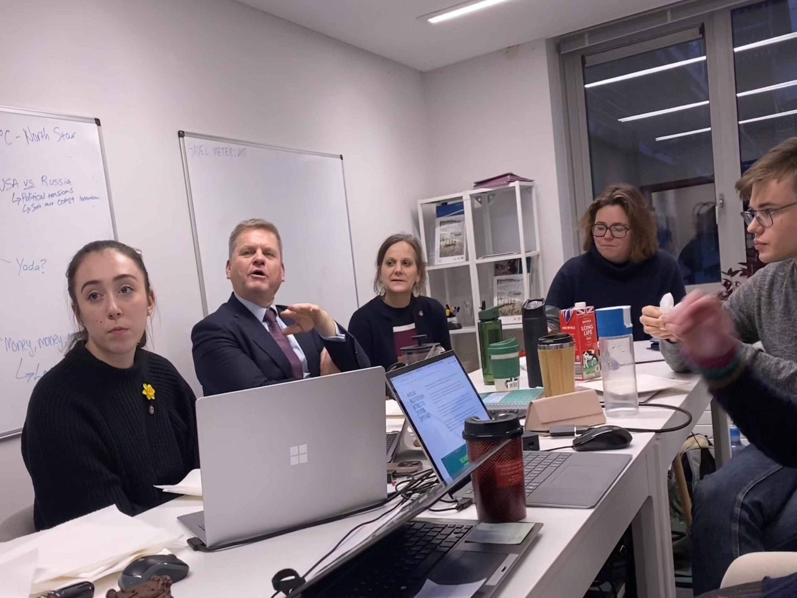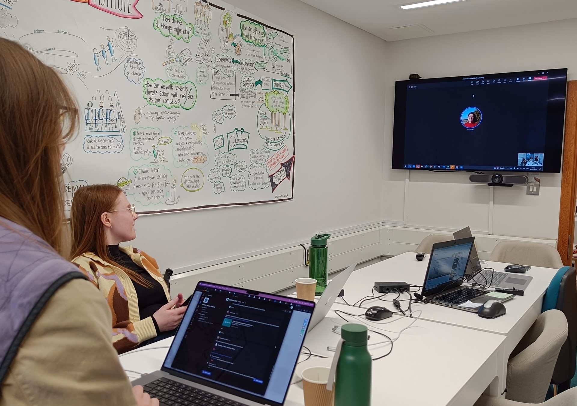 During COP28 itself, an updated, and dedicated space was made available for the COPCAS course in the Walker Institute, with face-to-face support from one member of the Walker Team during each session. Every weekday and one Saturday during COP28, the Climate Action Studio was open from 08:45 am until 17:00 pm. Students from the Climate Action Studio connected with students attending COP28 in Dubai via MS Teams calls twice a day. Students on the ground provided updates on the issues arising every day and reported on sessions they attended as well as the general vibe of COP28.